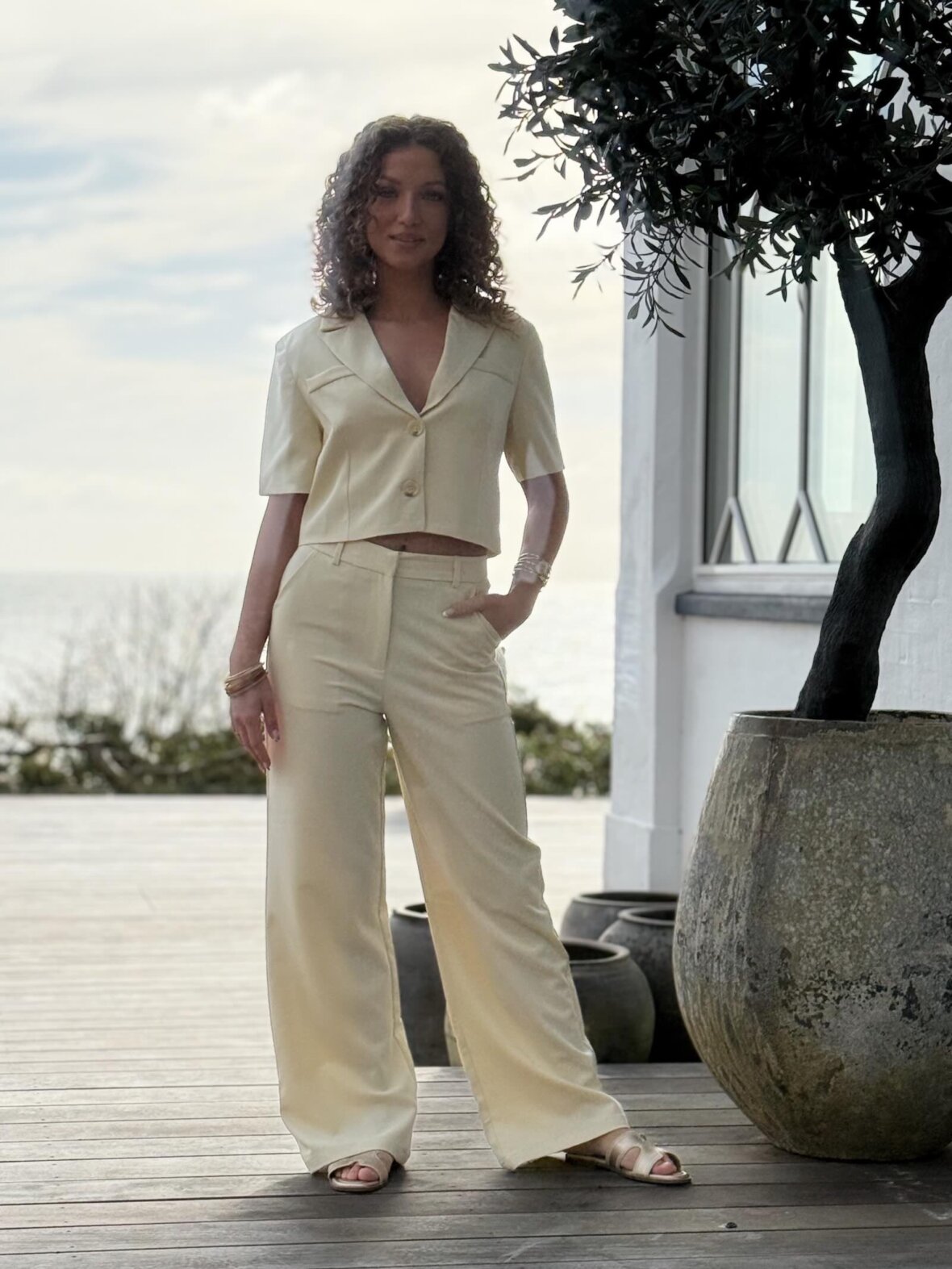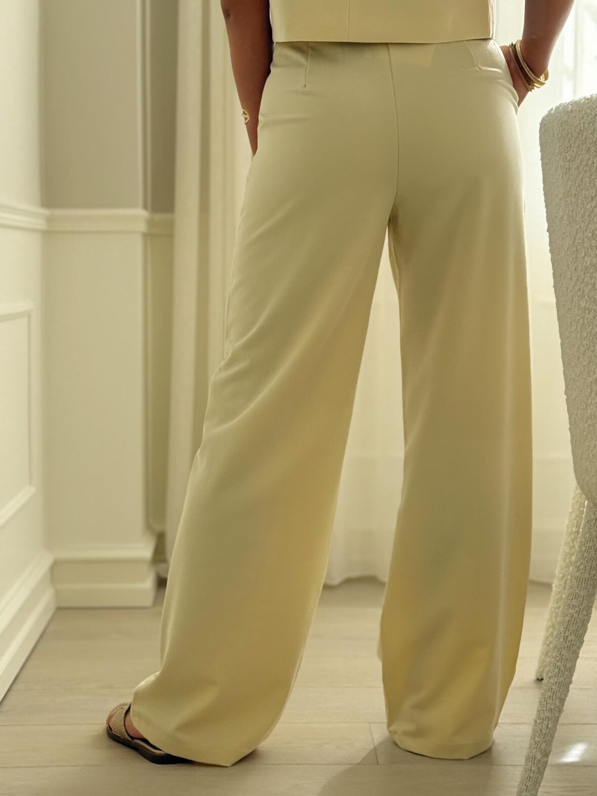 Lysegule bukser til dame med vidde ben og elegant, let fald. Disse stilfulde bukser giver et feminint og moderne look med en flatterende pasform, der både er komfortabel og chic. Perfekte til sommerens outfits og nemme at style med toppe, skjorter eller blazere. Ideelle til både hverdag og festlige anledninger, hvor du ønsker et lyst og eksklusivt udtryk.