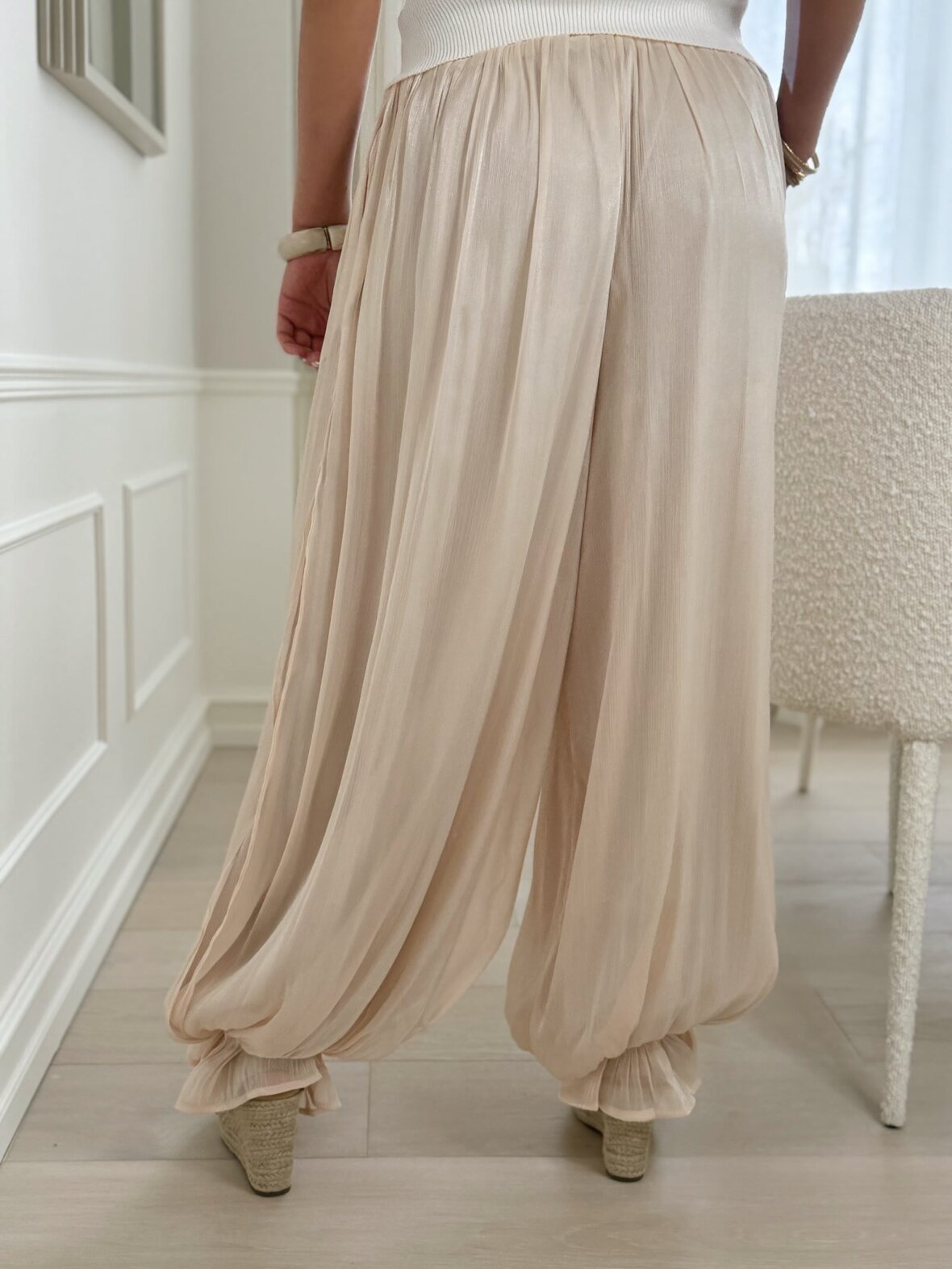 Elegante bukser i en let og luftig kvalitet med et feminint og afslappet udtryk. Designet har elastik i taljen for en komfortabel pasform samt smukke, bløde fald, der giver et eksklusivt look. De brede ben samles let ved anklerne og skaber en moderne silhuet. Perfekte til både hverdag og sommerens events, hvor stil og komfort går hånd i hånd.