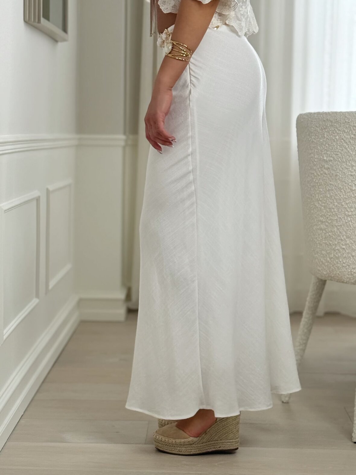 Elegant lang nederdel i en smuk cream nuance med et let og luftigt fald. Den enkle silhuet giver et stilrent og tidløst udtryk, mens det bløde materiale sikrer en behagelig pasform hele dagen. Nederdelen sidder flot i taljen og falder naturligt, hvilket gør den nem at style til både hverdag og fest. Perfekt sammen med en feminin top eller skjorte for et elegant look, eller med en strik for en mere afslappet stil. En klassisk garderobefavorit, der kan bruges sæson efter sæson.