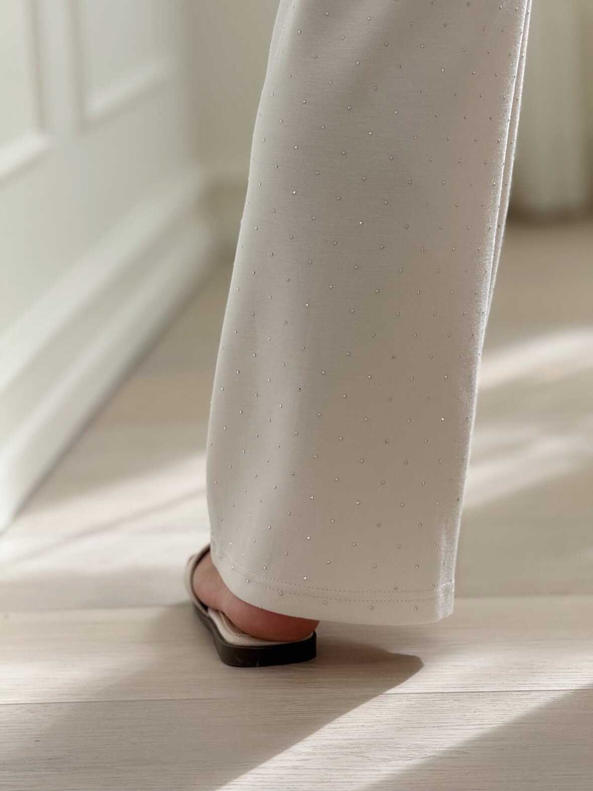 Elegante bukser i en smuk cream nuance med fine små sten, der giver et diskret og eksklusivt shine. Modellen har en flot, let vidde i benene og en behagelig pasform, der falder smukt langs kroppen. Den enkle silhuet kombineret med de glimtende detaljer gør bukserne perfekte til både festlige anledninger og stilfulde hverdagslooks. Style dem med en skjorte eller en feminin top for et elegant udtryk – eller med en strik for et mere afslappet look. Et must-have til garderoben, hvis du ønsker komfort og elegance i ét.