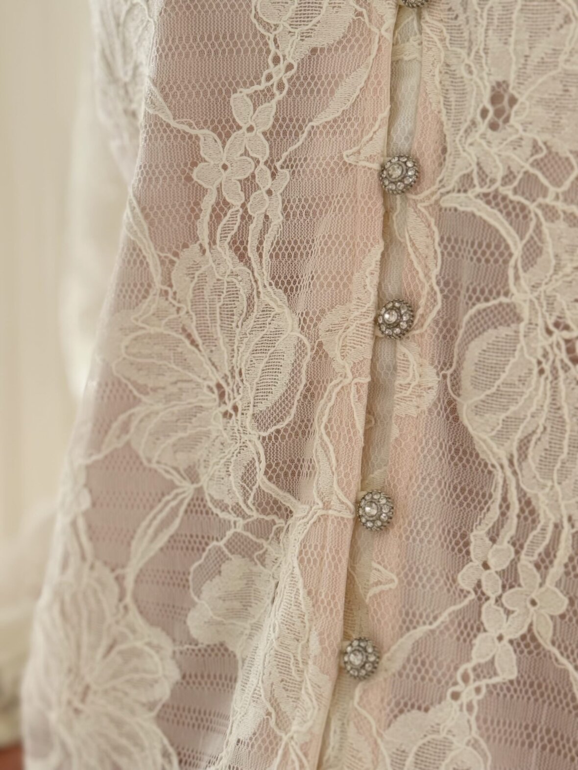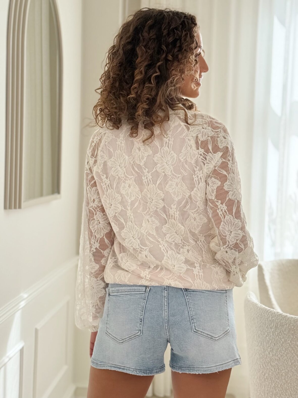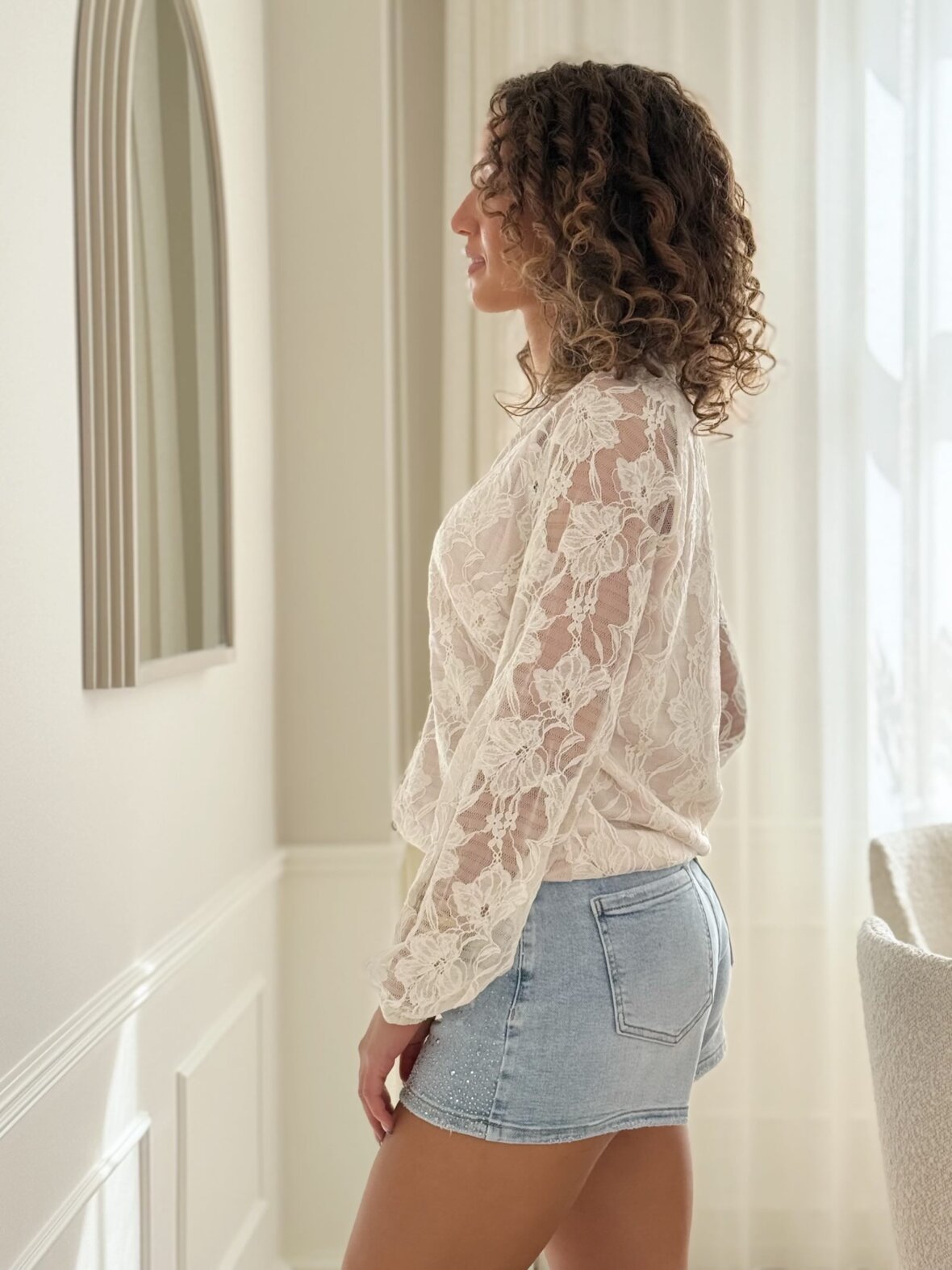 Elegant skjorte i en smuk cream nuance med fine blonde-detaljer, der giver et romantisk og feminint udtryk. Den let transparente kvalitet kombineret med den bløde underdel skaber et eksklusivt look. Skjorten har lange ærmer med let volumen og en dekorativ knaplukning foran, som tilfører et klassisk touch. Den løse pasform gør den behagelig at have på og nem at style til både hverdag og mere festlige anledninger. Style den med jeans for et afslappet look eller med en nederdel for et mere elegant udtryk.
